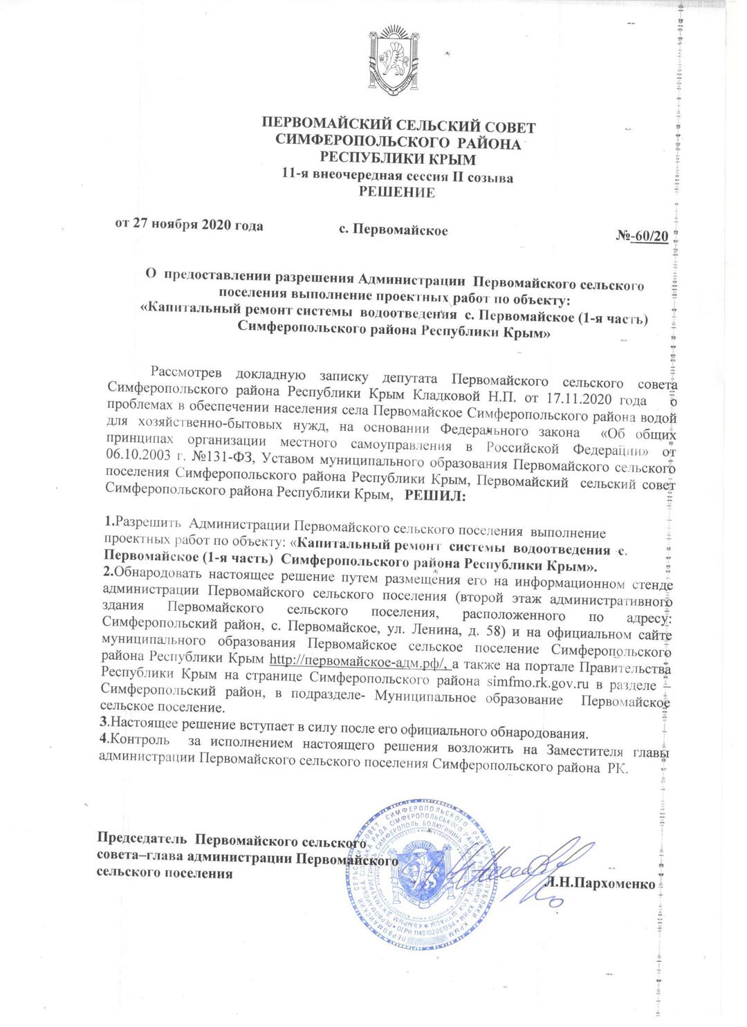 О предоставлении разрешения Администрации Первомайского сельского поселения выполнение проектных работ по объекту: «Капитальный ремонт системы водоотведения с. Первомайское (1-я часть) Симферопольского района Республики Крым»