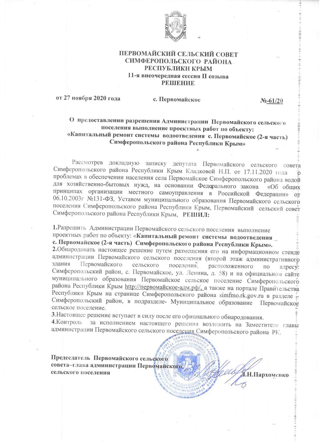 О предоставлении разрешения Администрации Первомайского сельского поселения выполнение проектных работ по объекту: «Капитальный ремонт системы водоотведения с. Первомайское (2-я часть) Симферопольского района Республики Крым»